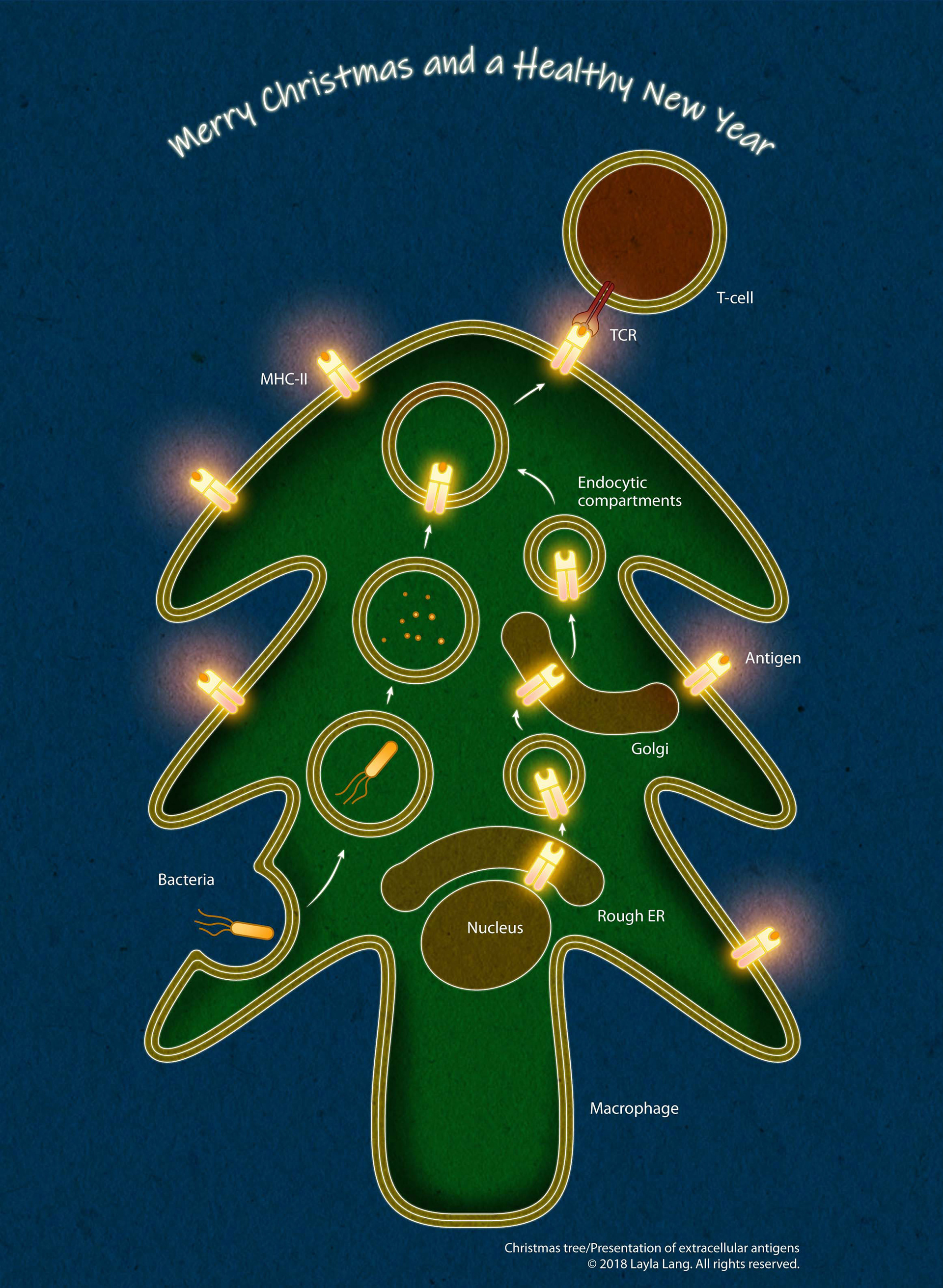 Weihnachtskarte im Stil einer molekularbiologischen Illustration.